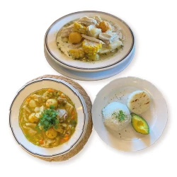 Colombian sausage, shredded beef, beans, avocado, fried plantains, rice, corn cake and diced sweet plantains.