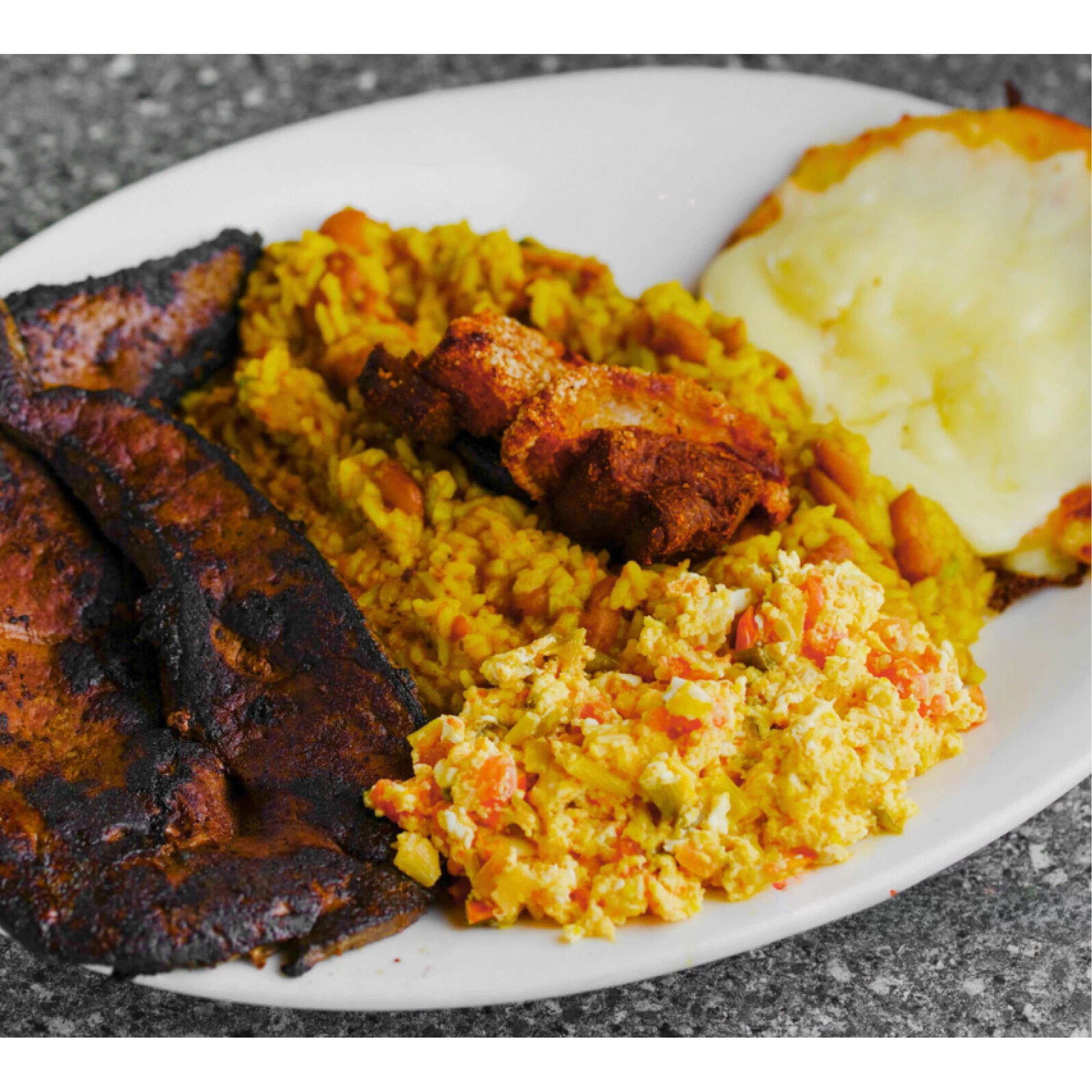 Grilled steak or ground beef or chicken, rice, beans, pork belly, colombian sausage, one fried egg, sweet plantains and corn cake.