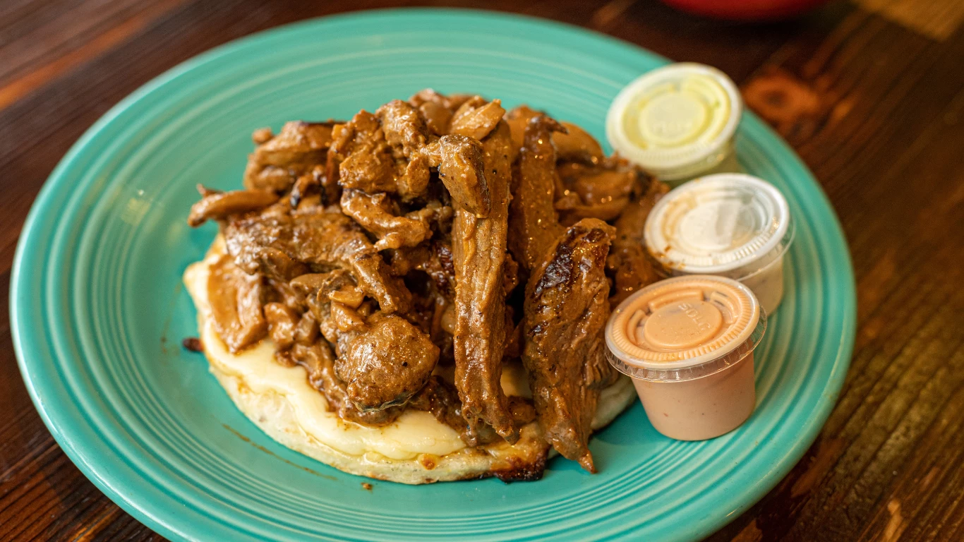 White corn cake with mozarella cheese, chopped grilled steak and mushrooms.