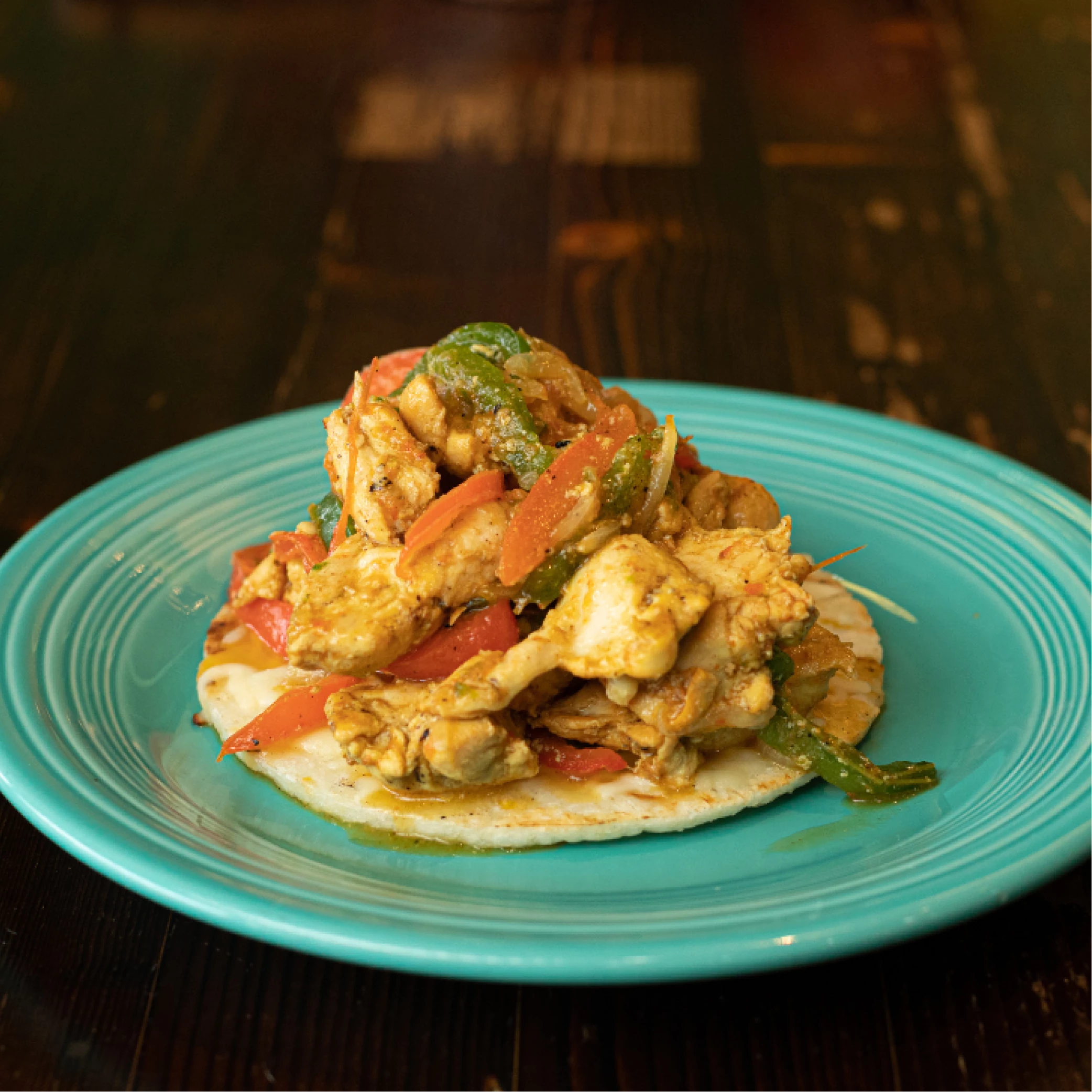 White corn cake with cheese, steak or chicken, onion, tomatoes, and peppers.