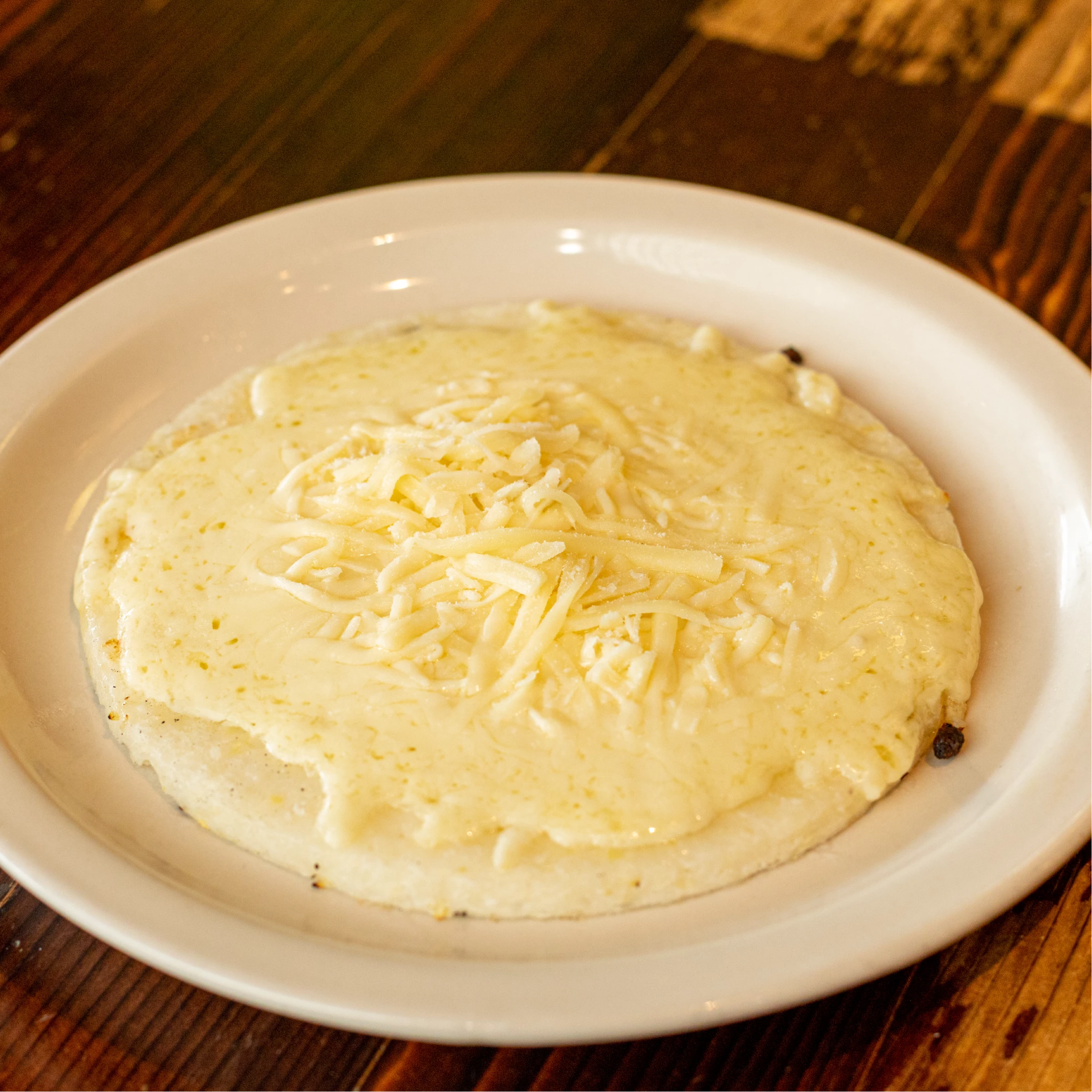 White corn cake with mozarella cheese, shredded beef or chicken and sauce of choice.