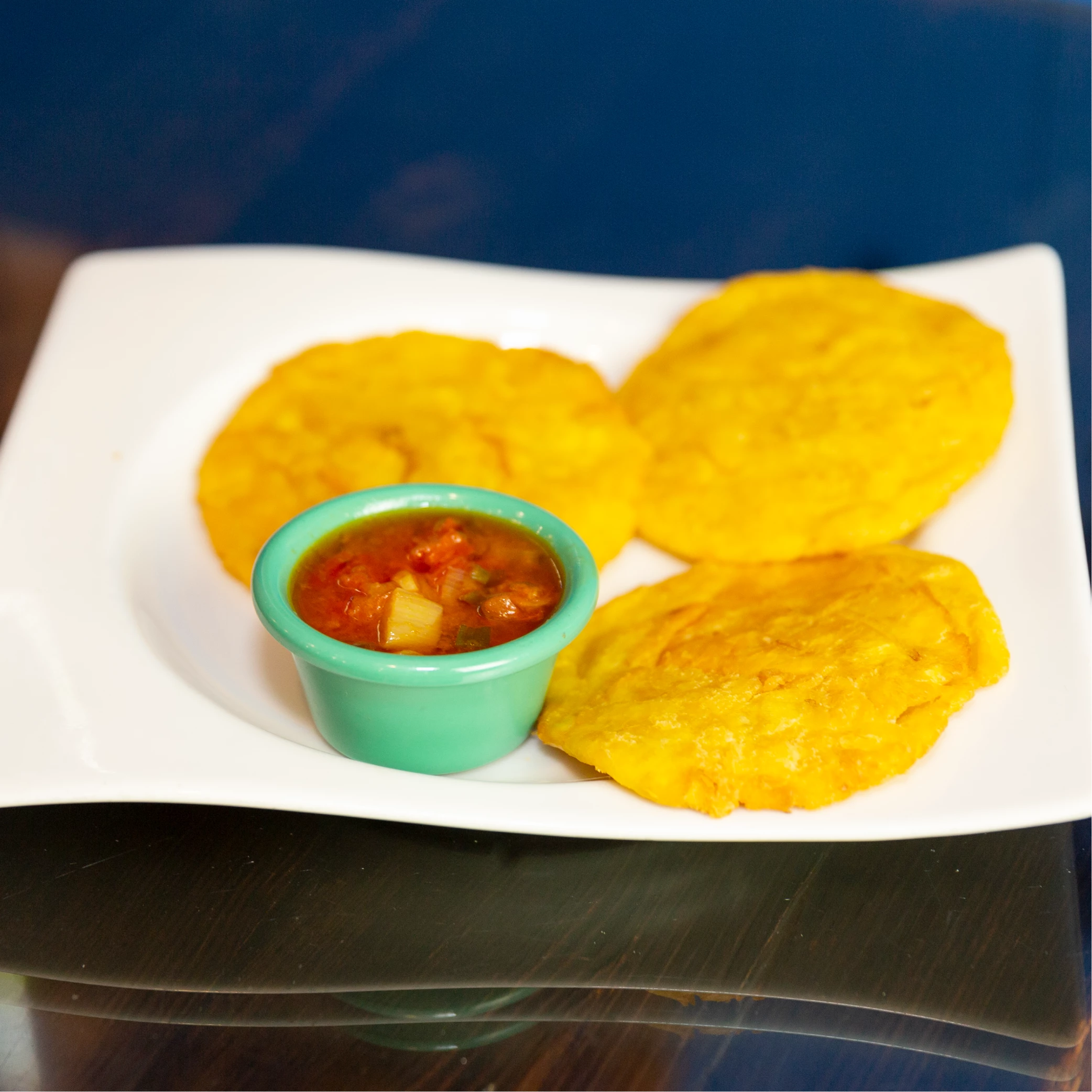 White corn cake with mozarella cheese, colombian sausage and sauce of choice.