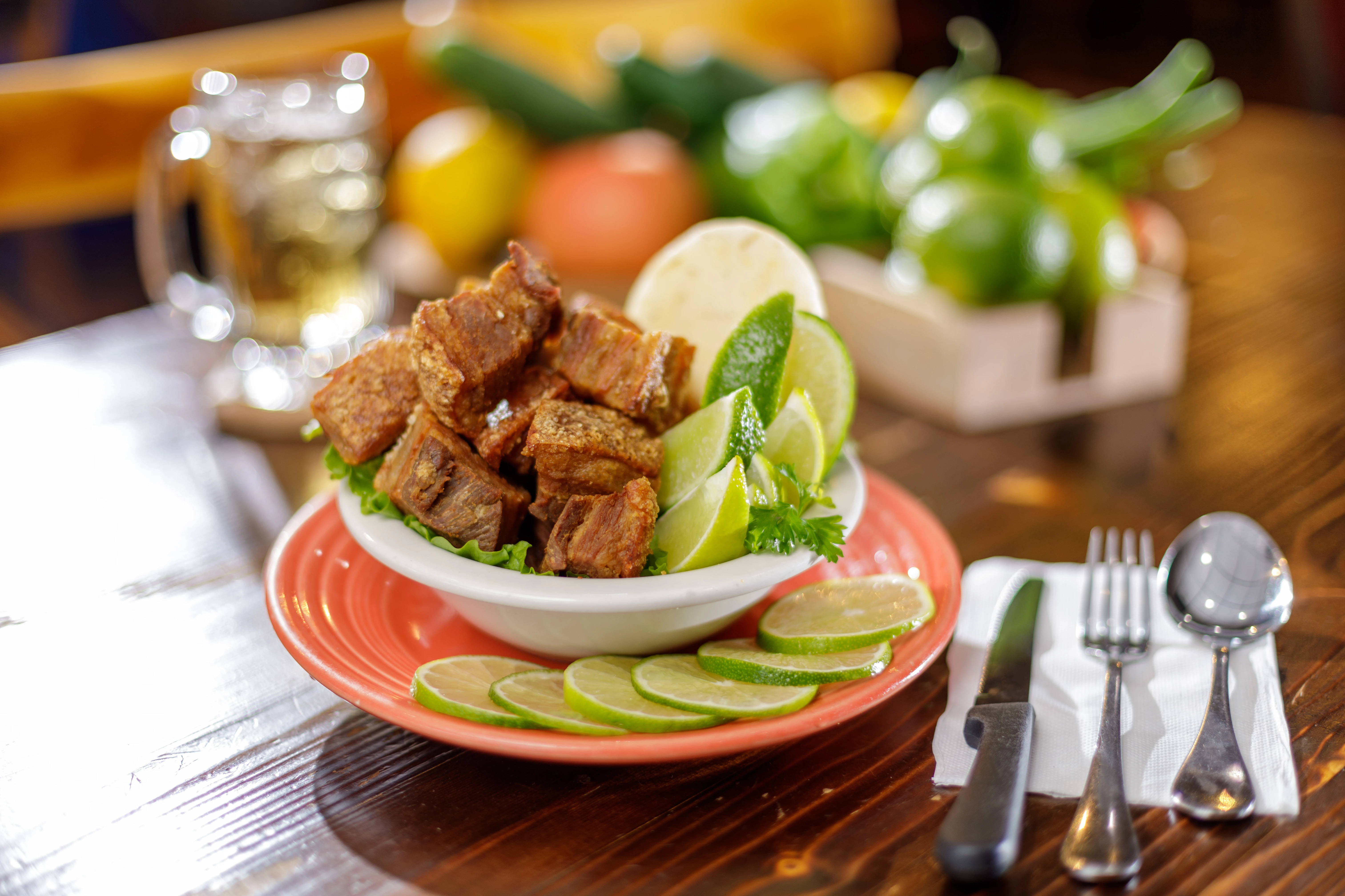 White corn cake with mozarella cheese, beans, creole sauce, pork belly and colombian sausage.