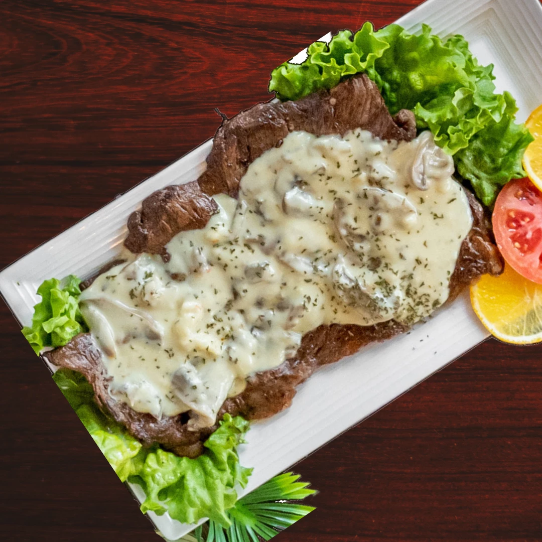 Tender steak topped with creamy mushroom sauce, served with two sides rich and satisfying.