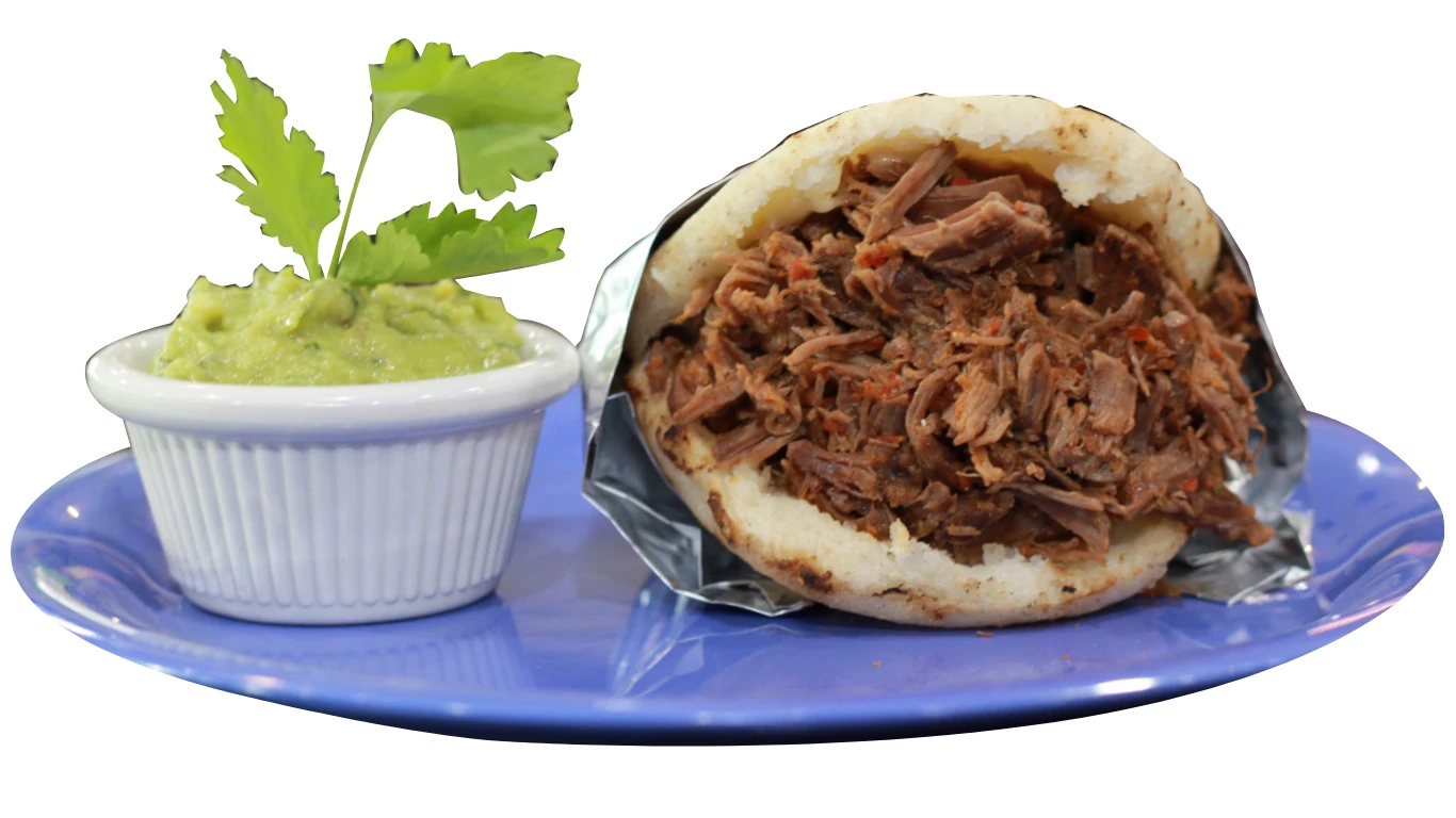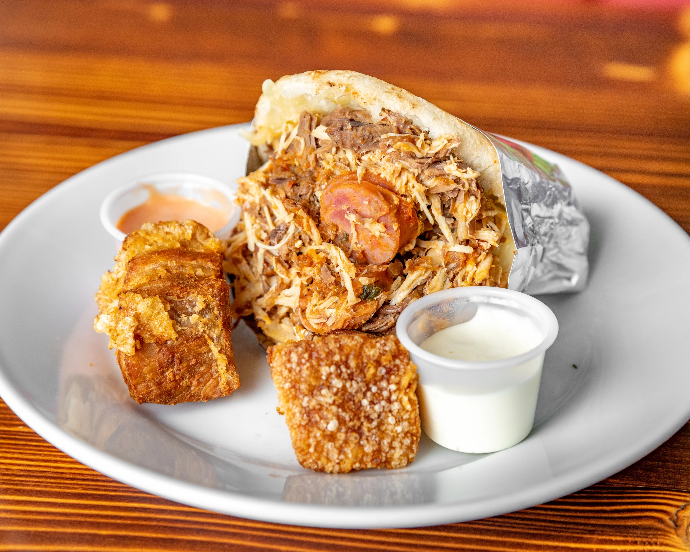 White corn cake with mozarella cheese, shredded chicken, shredded beef, pork belly and colombian sausage.