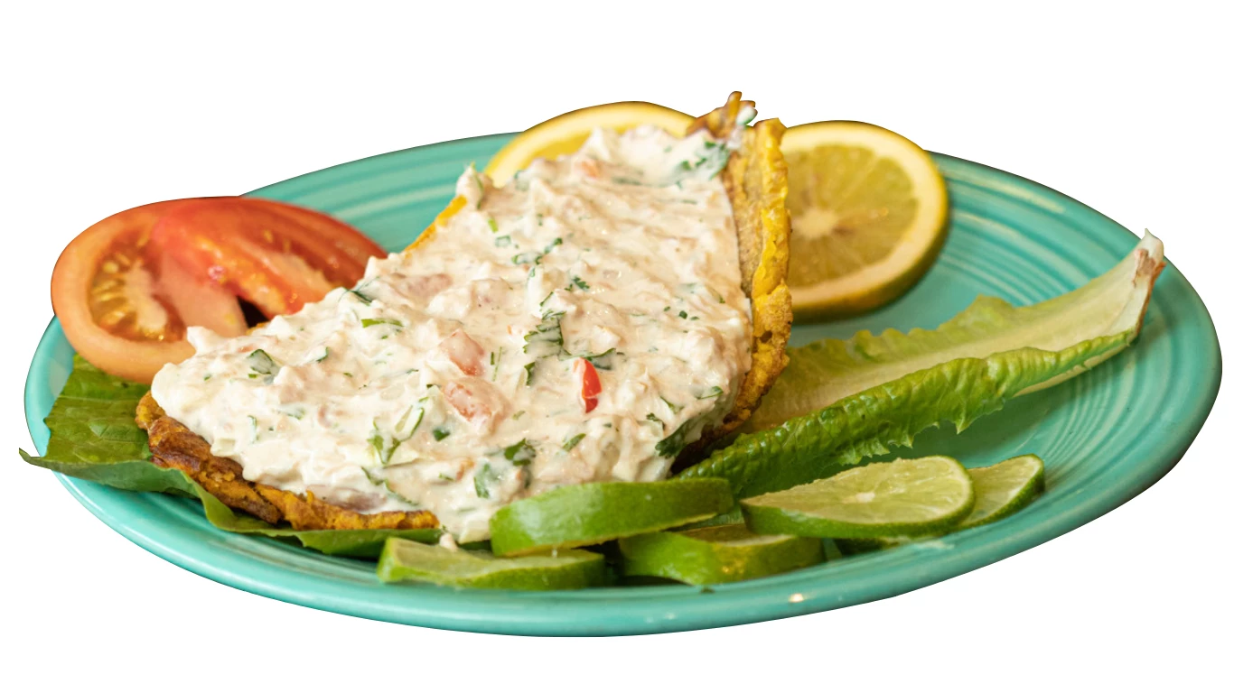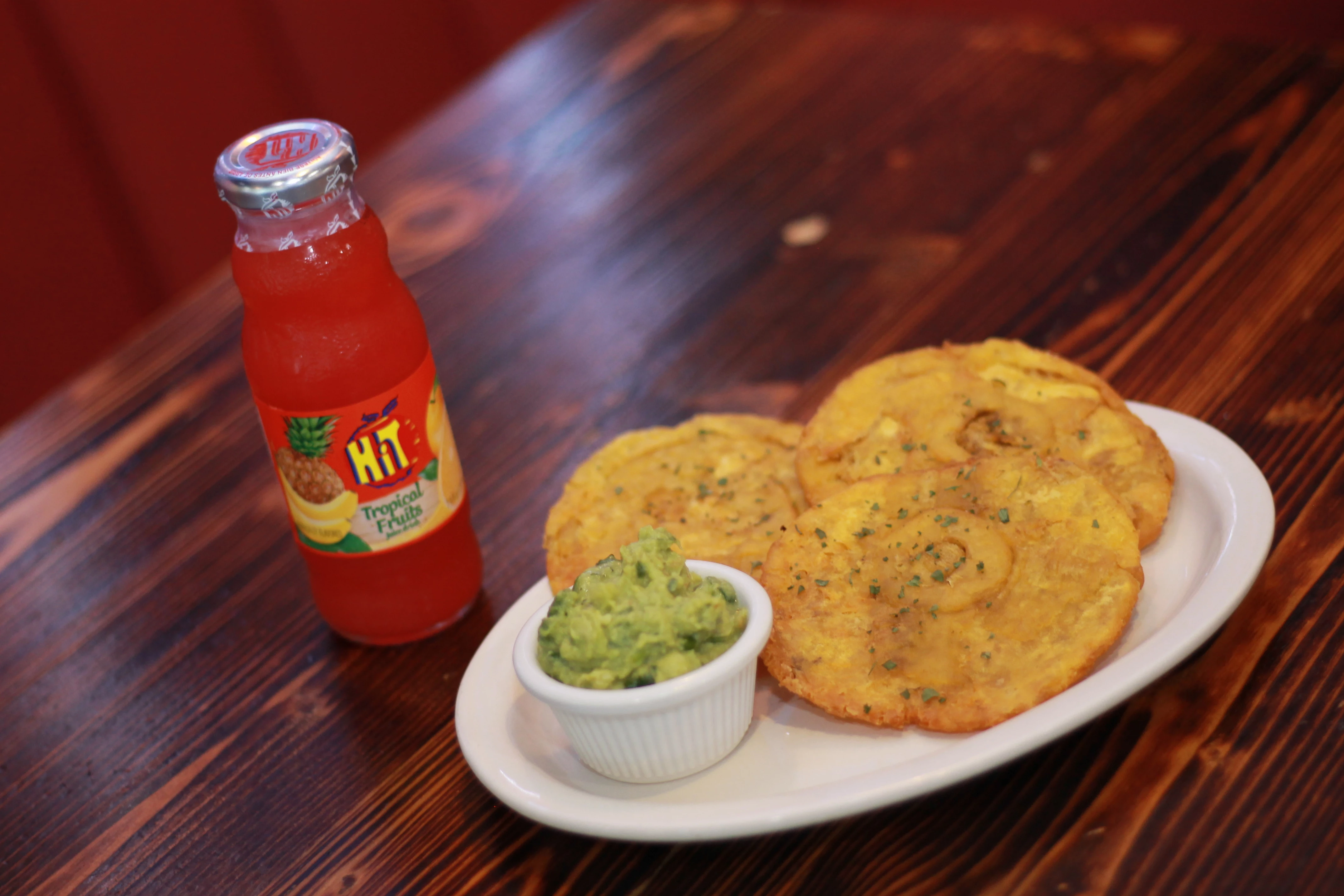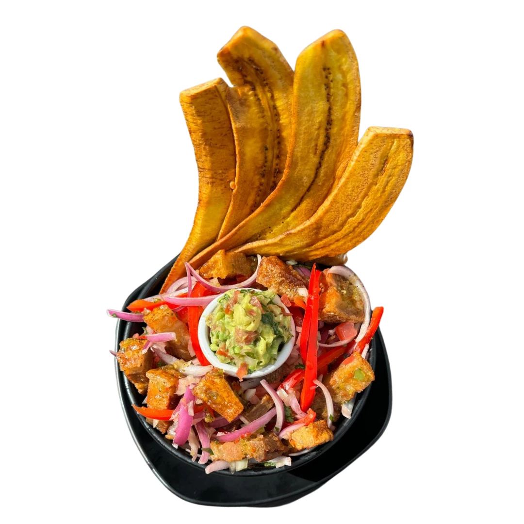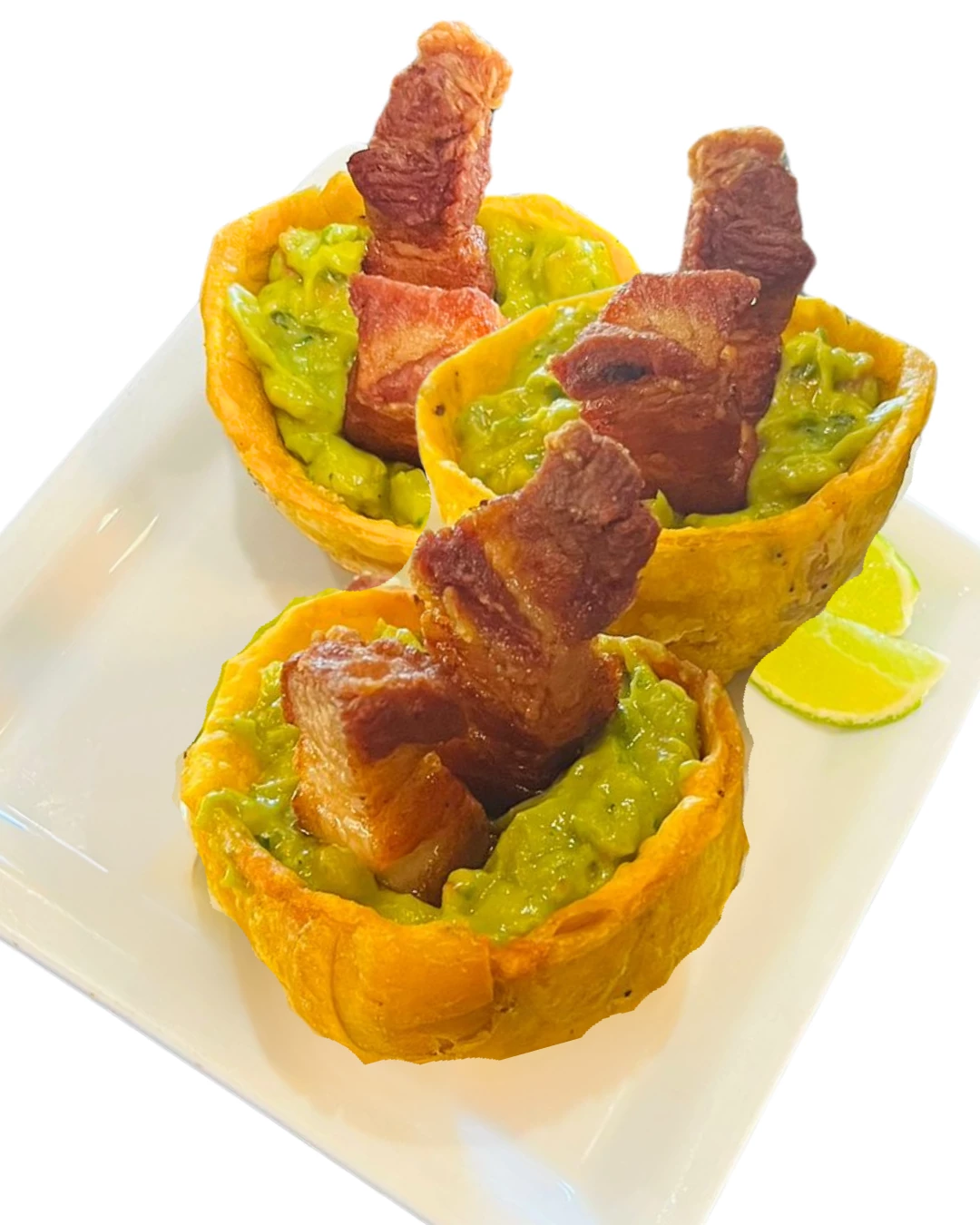 Crispy, sweet plantains served with creamy guacamole — a tasty and satisfying bite.