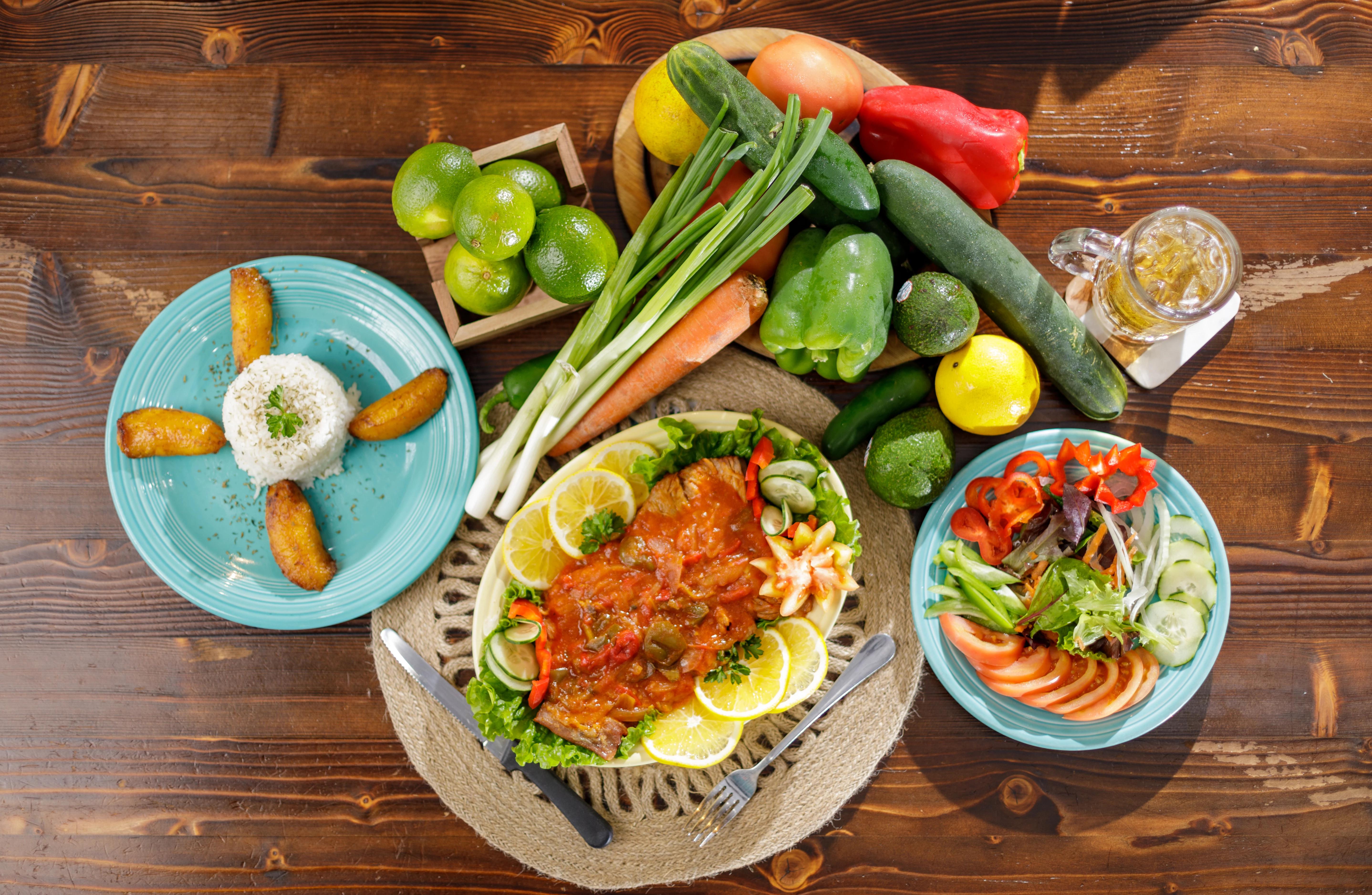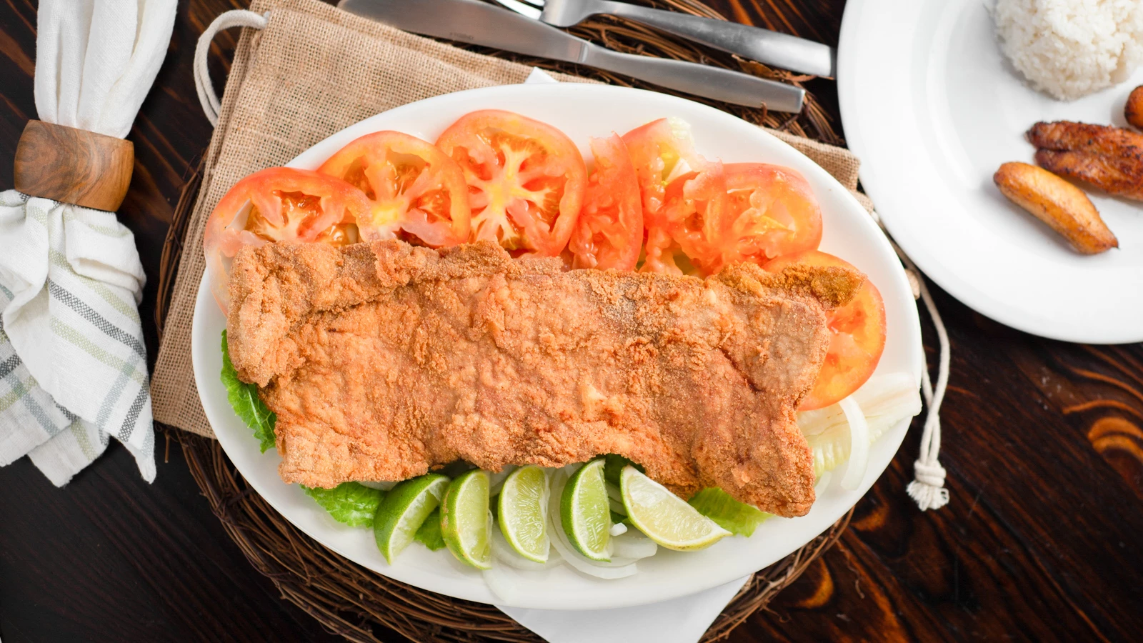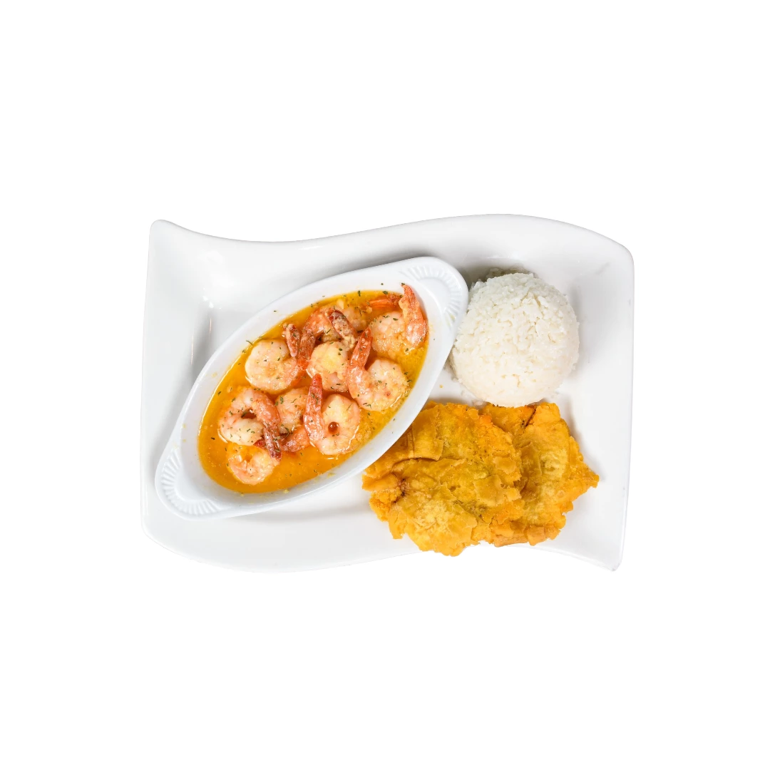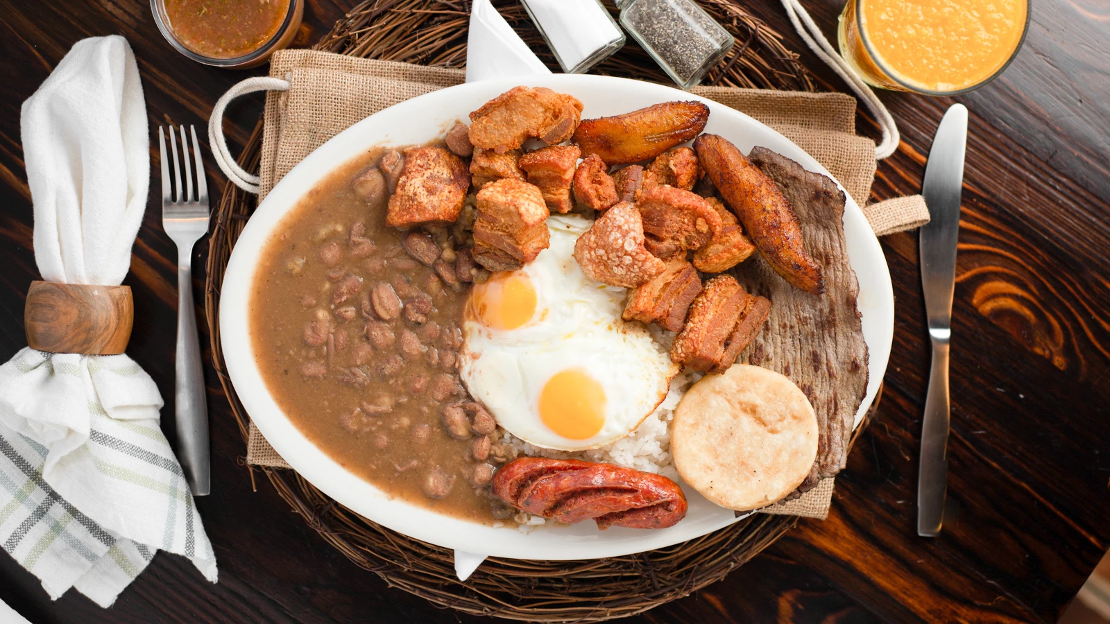 Grilled steak or ground beef or chicken, rice, beans, one fried egg, sweet plantains, corn cake, pork belly or colombian sausage.