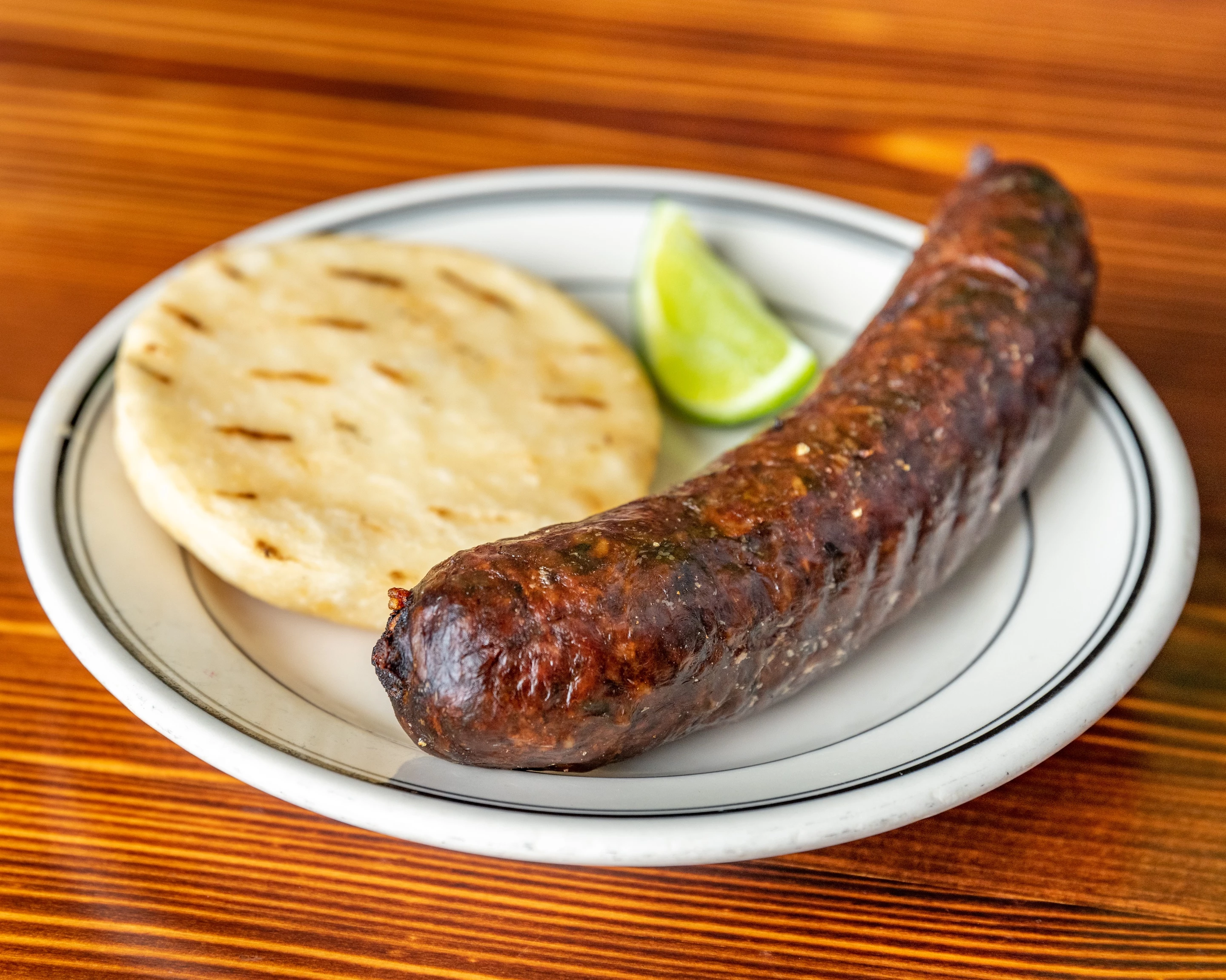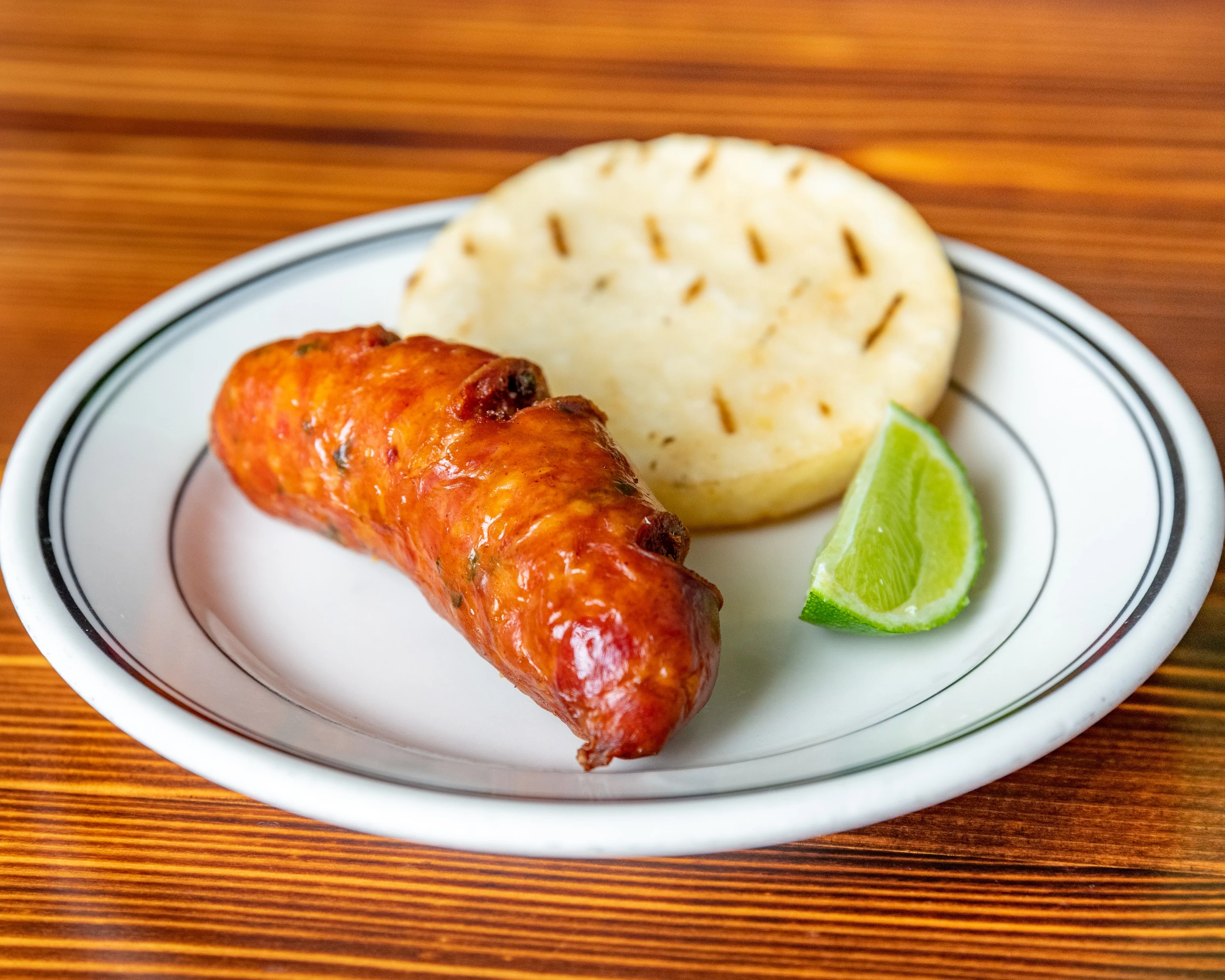 White corn cake with mozarella cheese, colombian sausage and sauce of choice.