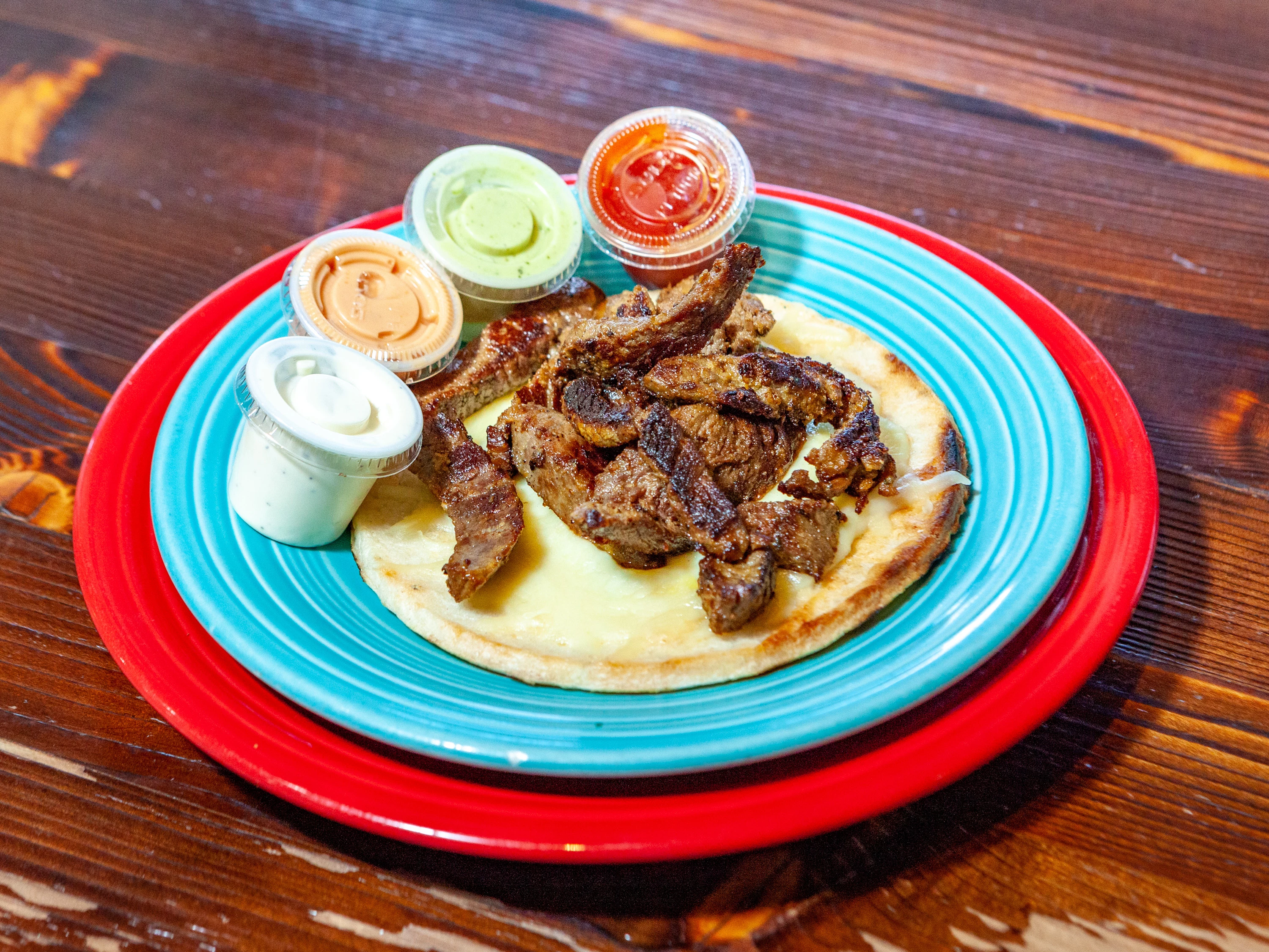 White corn cake with mozzarella cheese shredded beef or chicken and sauce of choice