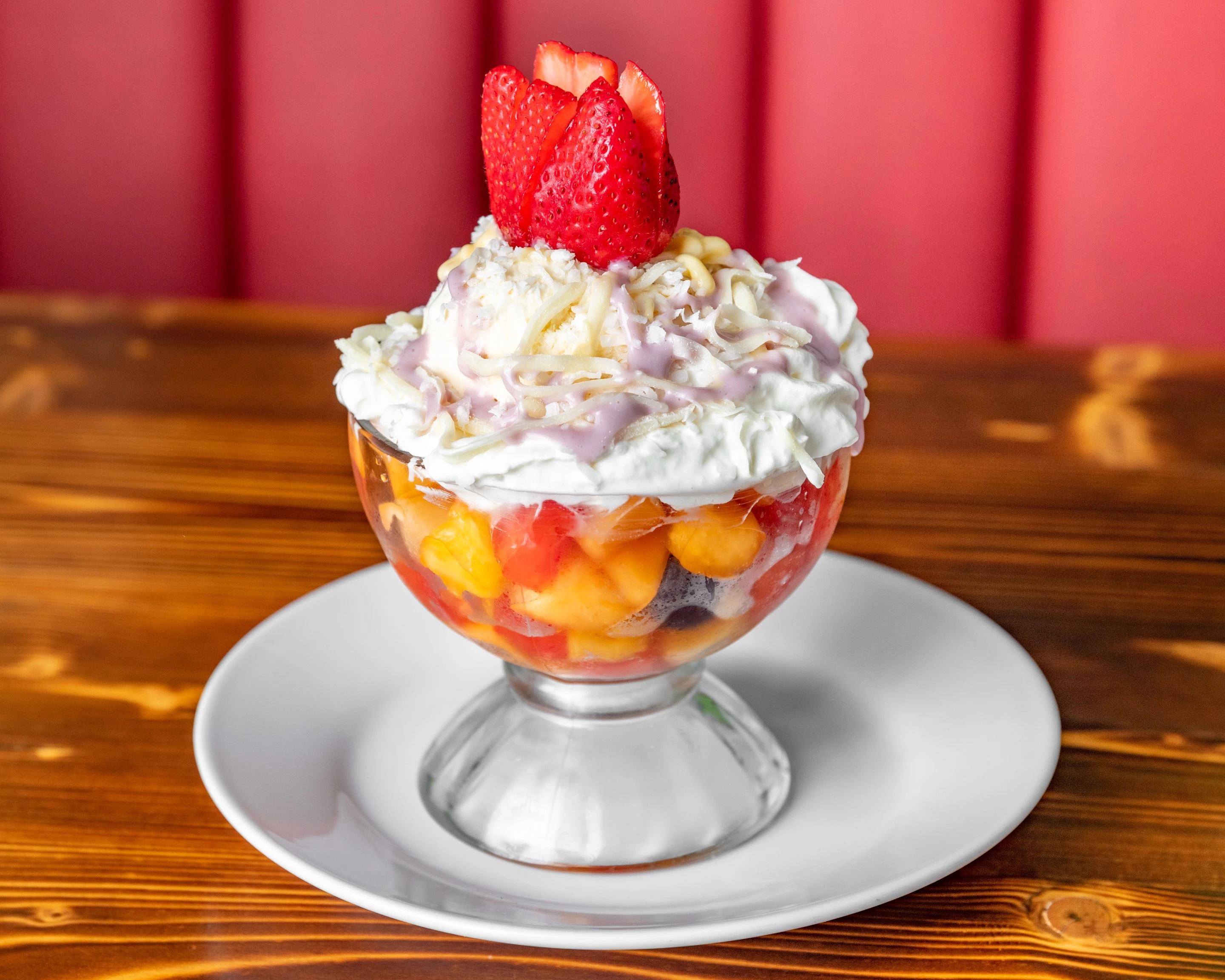 A sweet and refreshing mix of fruits topped with creamy ice cream perfect for any time.
