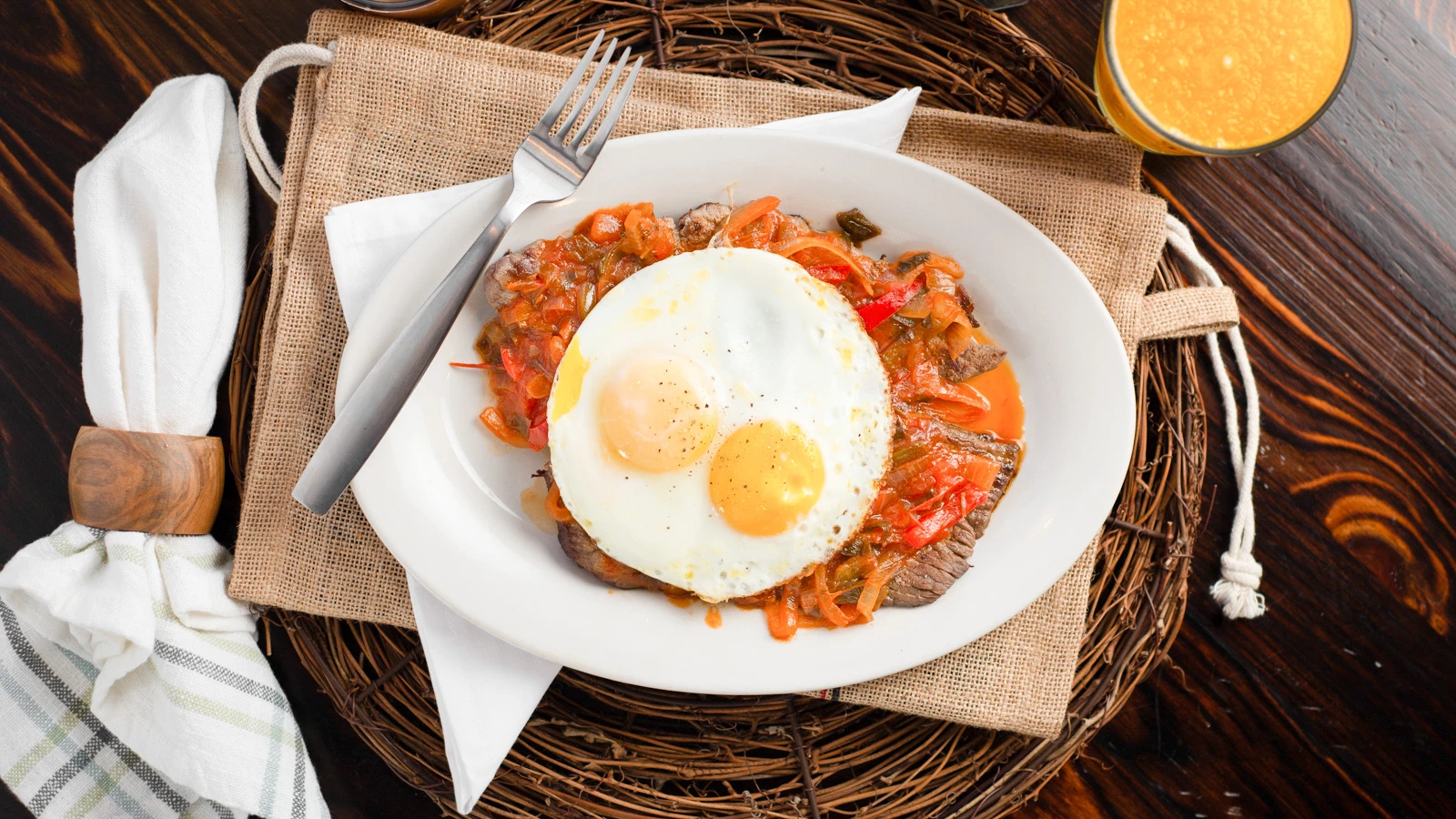 Savory grilled steak topped with Creole sauce and a fried egg, served with two classic sides — bold and satisfying.