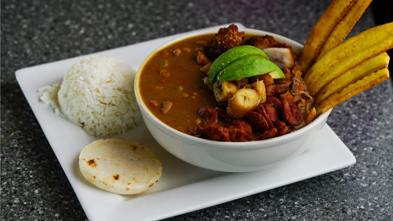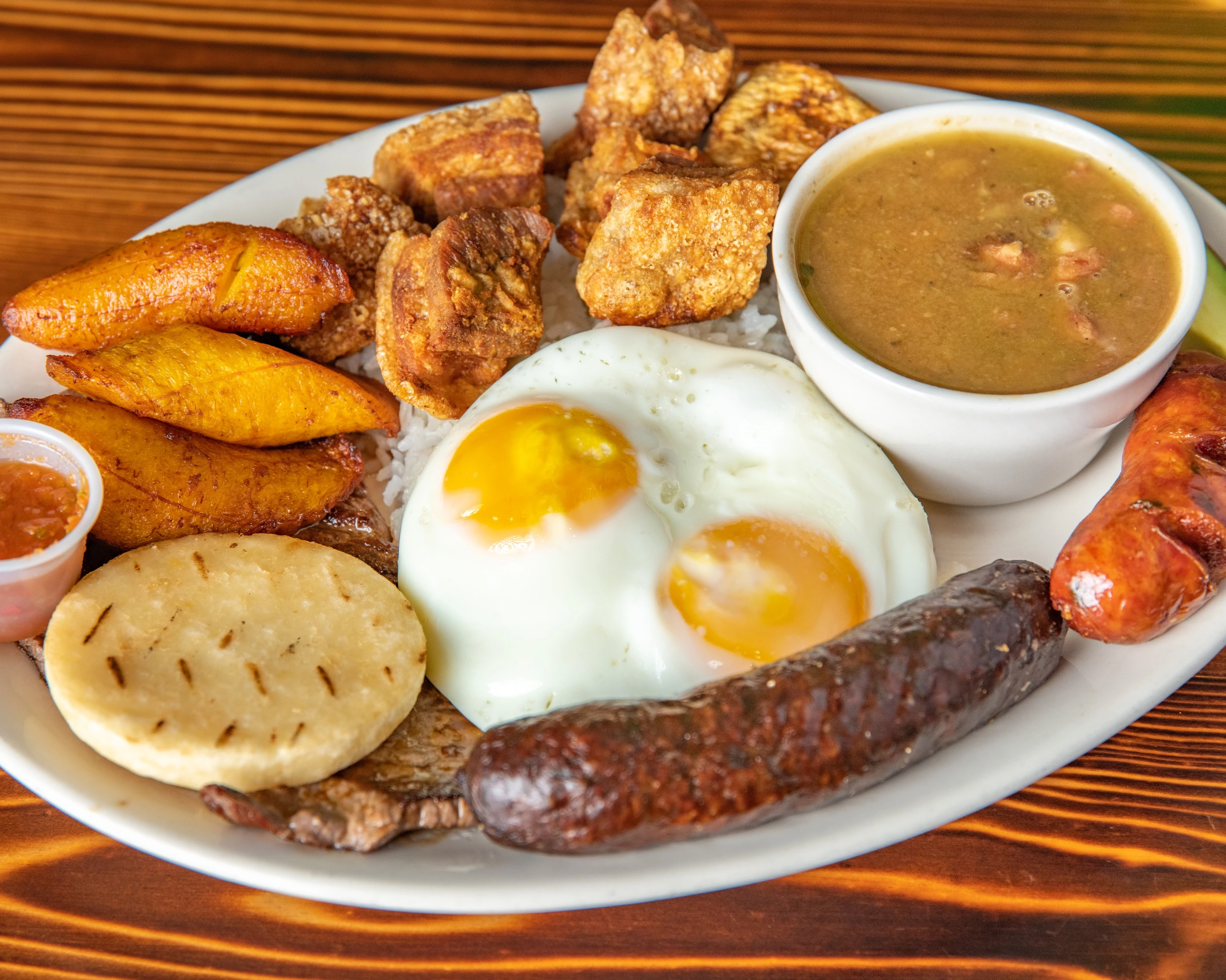 colombian sausage shredded, beefs , beans, avocado, fried plantais , rice , cork cake and diced sweet plantais