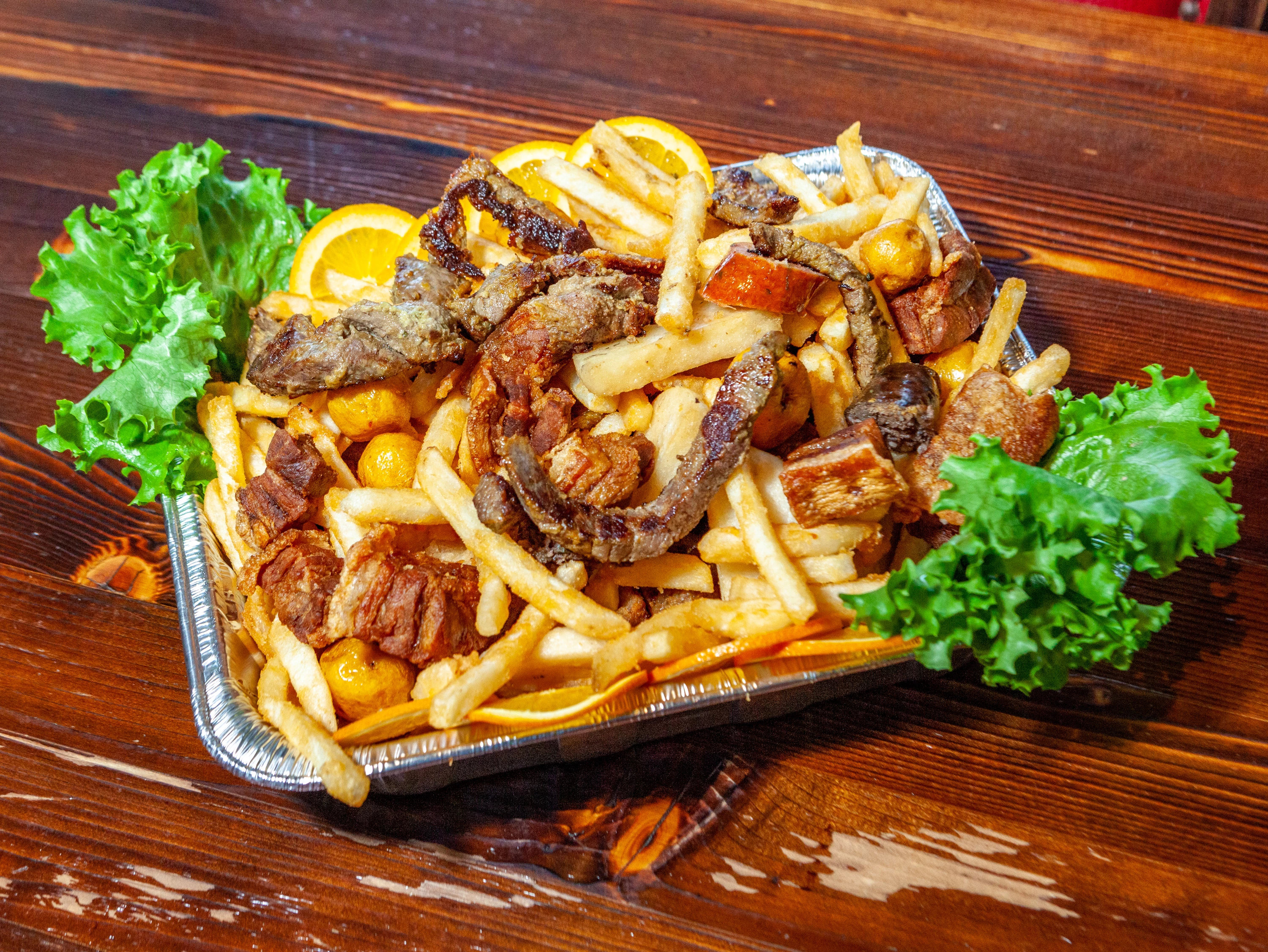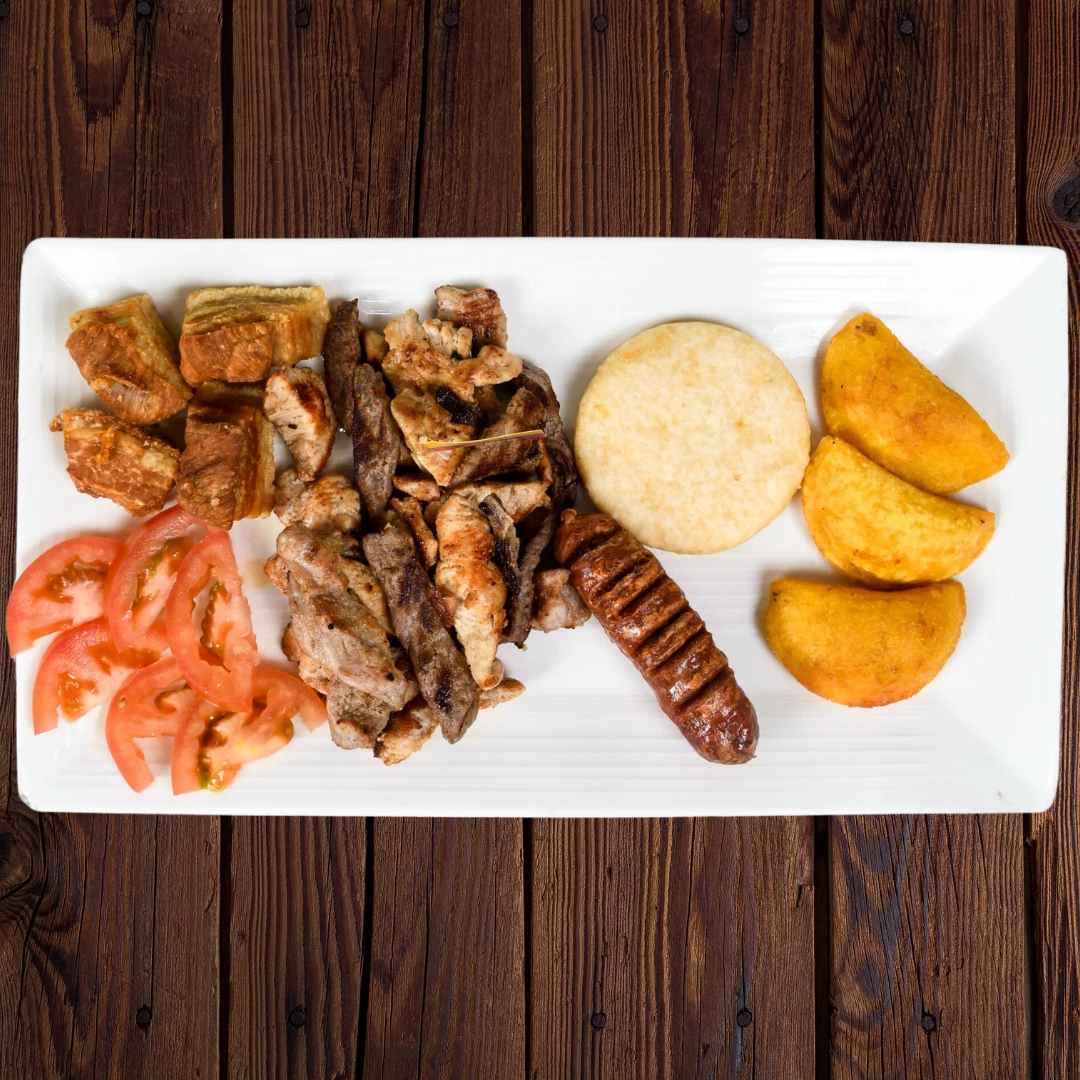 Steak , chicken , park ioin , colombian sausage , pork belly , blood sausage , french fries, tomatoes white corn cake sauces included and grandmas