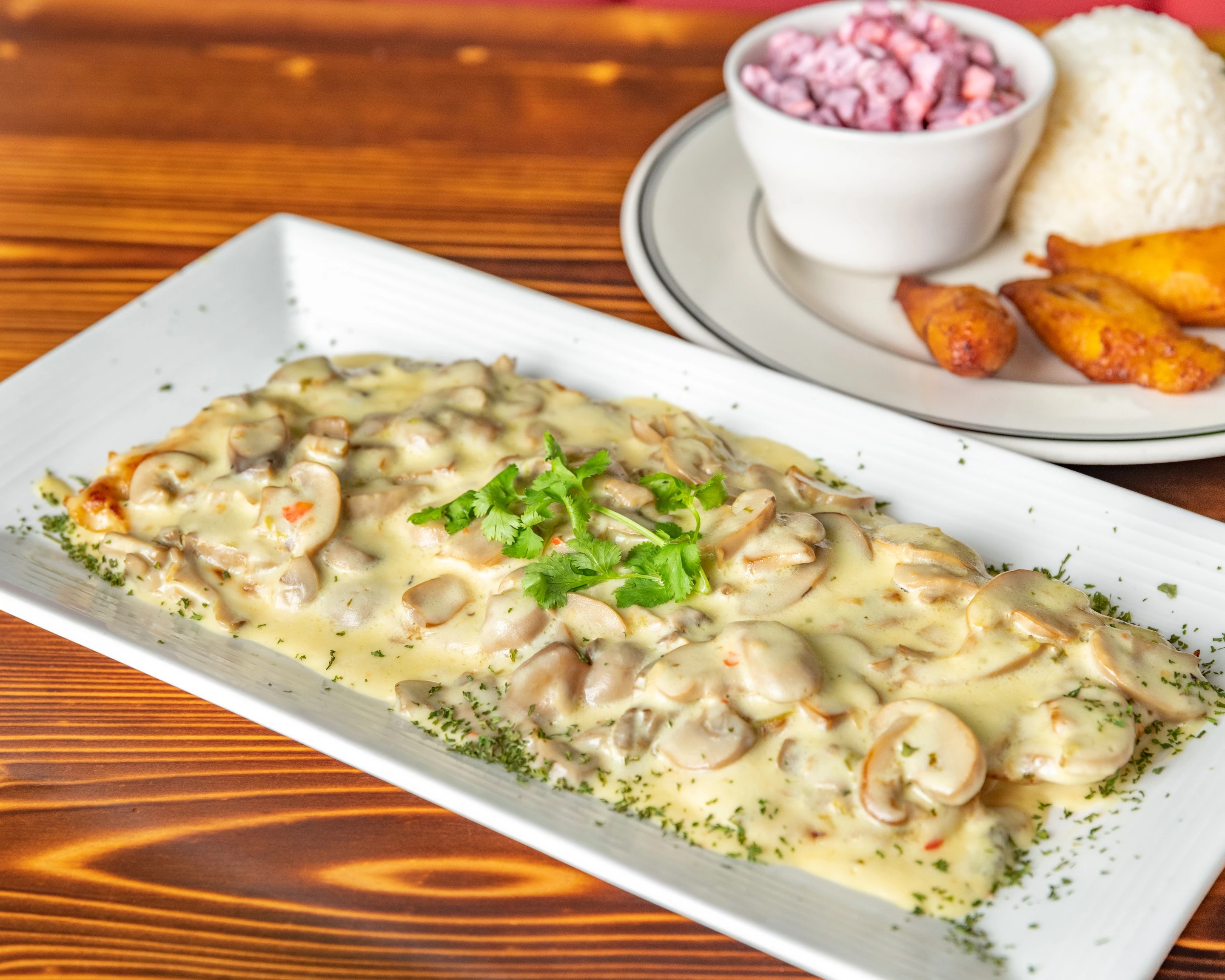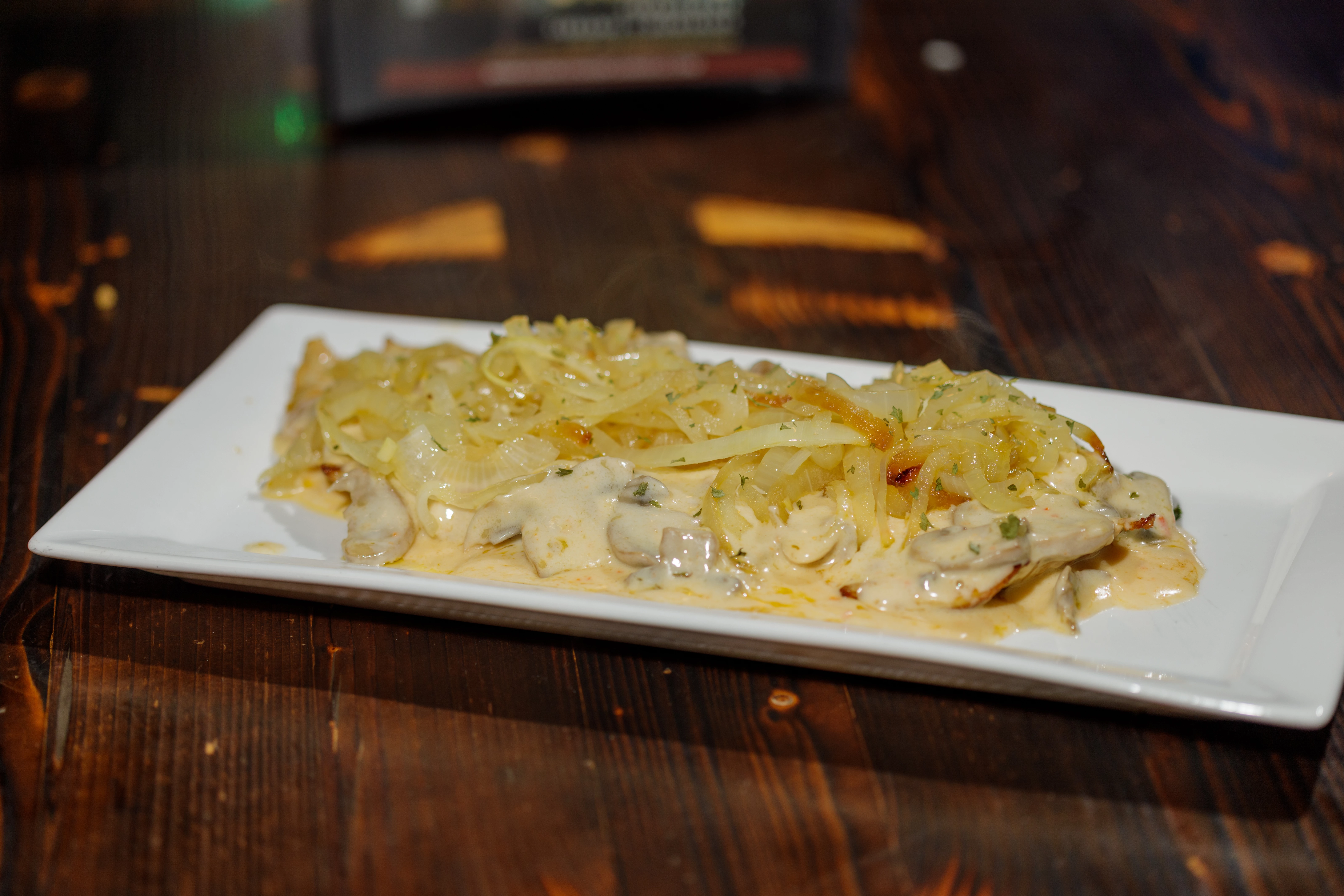 Tender steak topped with creamy mushroom sauce, served with two sides rich and satisfying.
