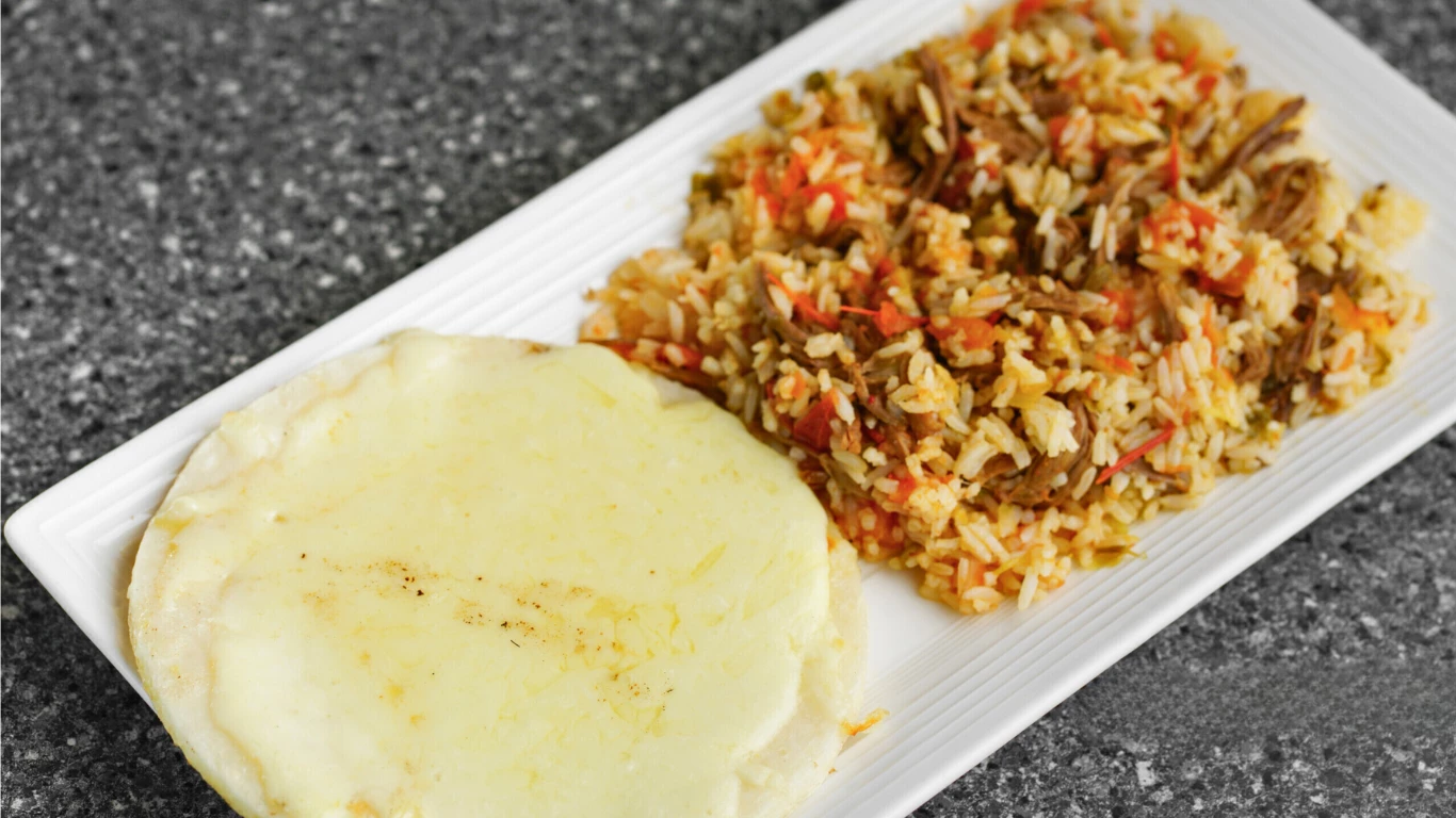 A hearty mix of rice and eggs, served with corn cake and melted cheese simple and satisfying