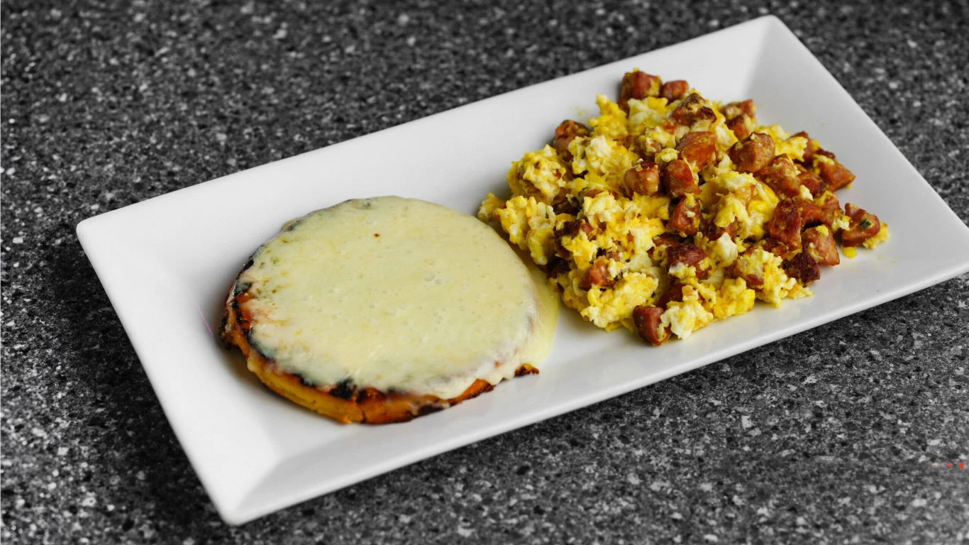 Fluffy eggs puired with sausage , served with corn cake and milted cheese