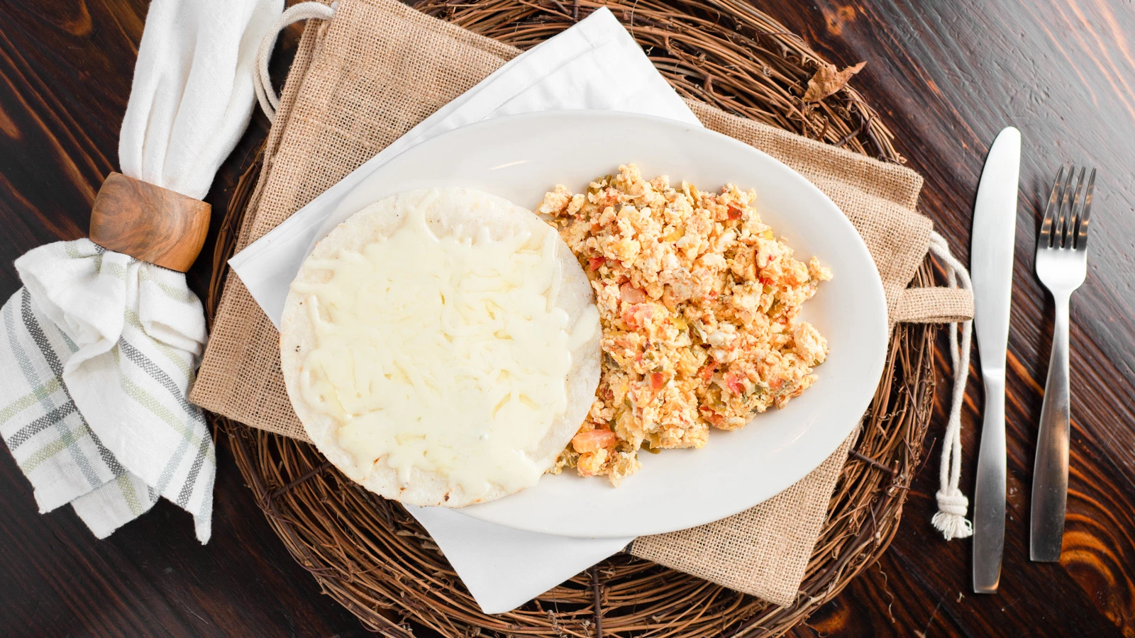 Fluffy eggs with tomato and onion , served with soft corn cake and melted cheese a fresh and tasty option